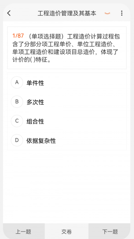 造价师新题库App上的题目设计非常科学,旨在帮助用户全面提升自己的专业能力,每个题目都配有详细的解析,此外App还提供了模拟考试功能,让用户可以在模拟的真实考试环境中进行练习,提高自己的应试能力。
