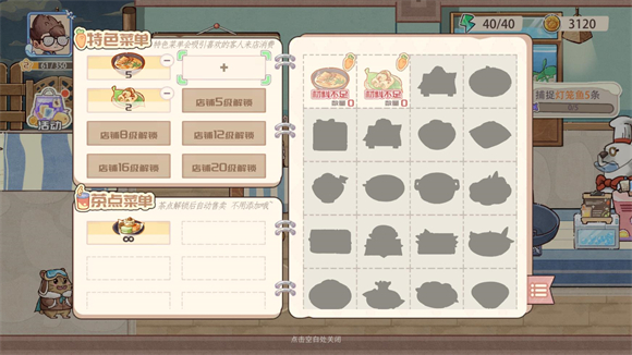 1、在餐厅界面中点击菜单板可以添加新的菜品,随着餐厅等级提升,可出售的菜品种类也会增加。