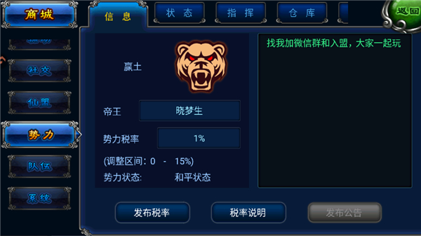 3、 多少级可以加入势力?角色等级达到20级后,即可解锁势力系统,加入心仪的势力,参与势力相关玩法与PK战役。