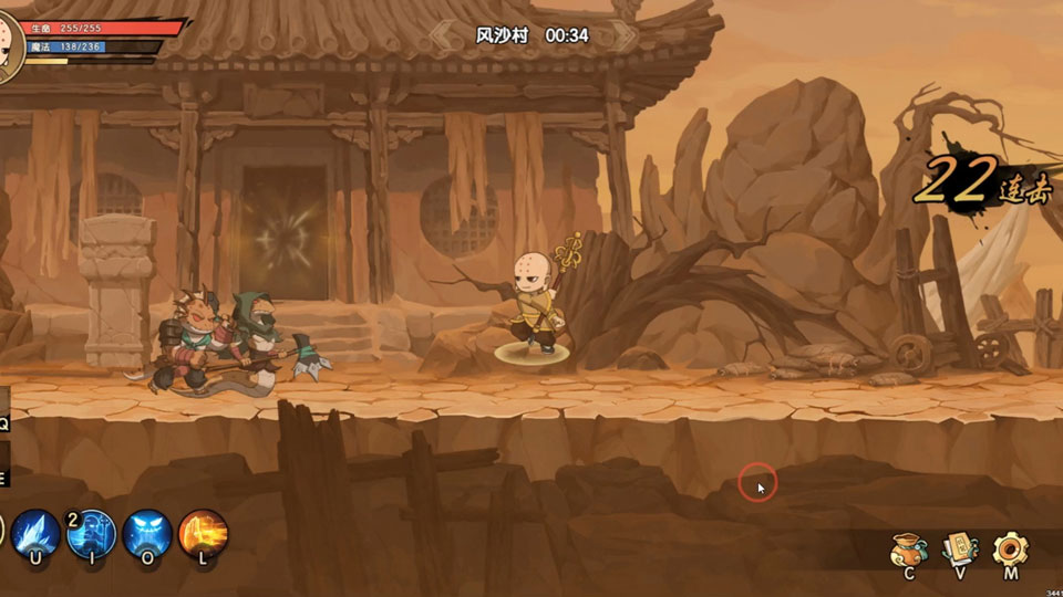 2、进入风沙村后,首先会遇到3个小怪,用普通攻击几棒子即可轻松击败。第一波小怪全部击杀后有几秒钟空挡,期间生命值会自动补满。生命值补满后第二轮小怪出现,数量变为6个,击杀难度不大。