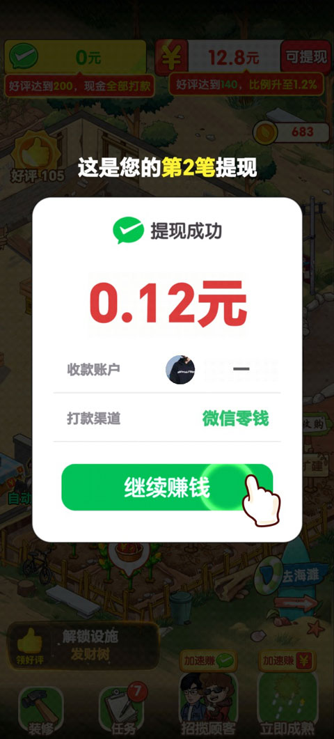 7、提现后点击继续赚钱,持续经营。
