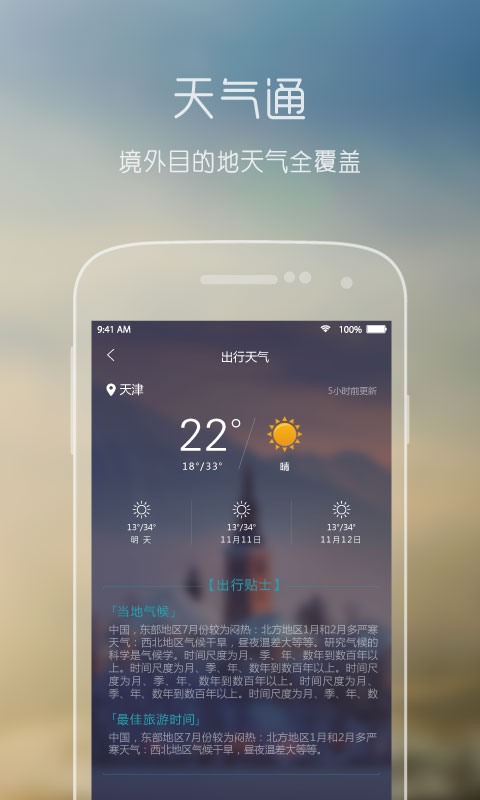 天气预报可能是我们较容易忽视的节目,但出门在外,天气信息的重要程度就飙升到旅行重要的事之top3中了。旅游点评帮您随时了解当地天气、推荐较佳旅游时间,助您制定好旅行计划。