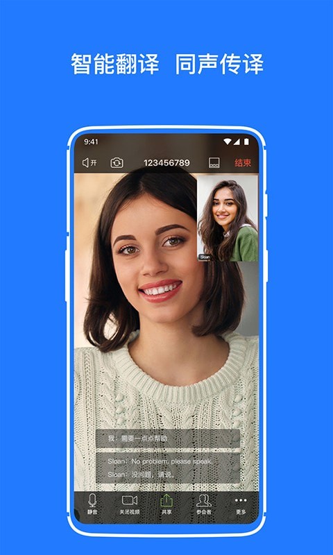 3、多种会议场景,自由讨论会议、语音会议、PTT对讲、视频直播等网络研讨会,万人观看直播,同声传译实时口语,支持中英等几十种语言。