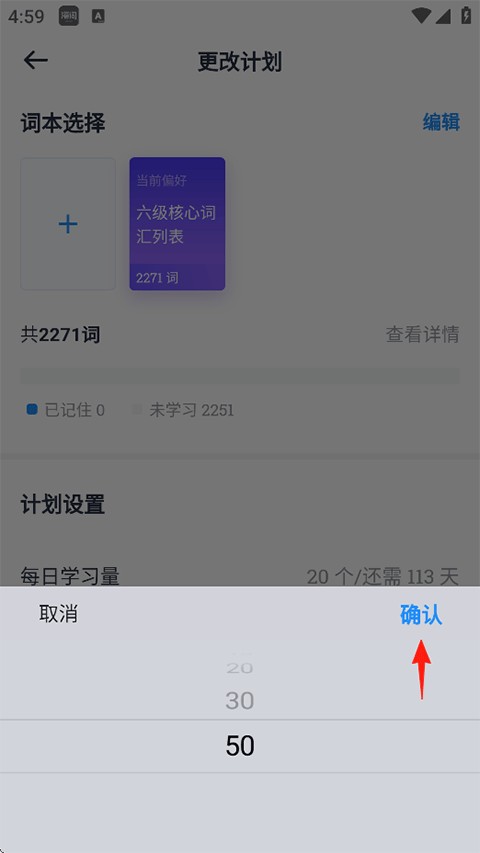 3、通过上下滑动的方式调整每日背单词数量,调整完毕后点击确认,即可完成设置。
