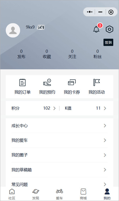 7、车辆绑定成功后进入爱车界面。配有TBOX的车型点击“车联车控”,返回凯越机车App。