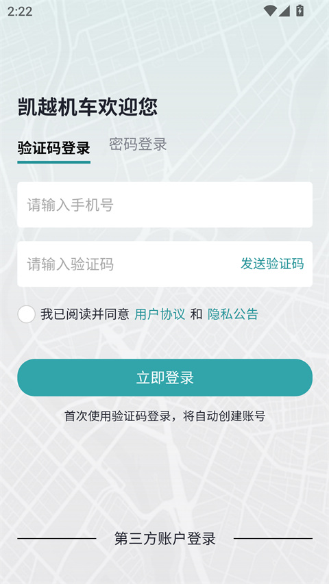 1、登录注册凯越机车App,使用提车时登记的手机号注册登录。