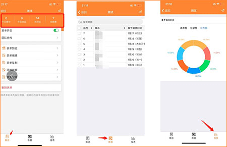 5、点击进入表单,概述页面展示最新数据,可前往数据页面查看所有数据,并在报表页面查看统计。