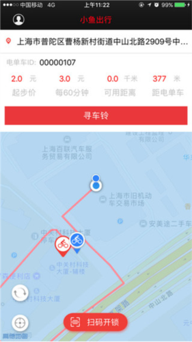 2、根据地图上的显示找到最近的共享电单车的位置,扫码解锁。同时也支持编码解锁哦!