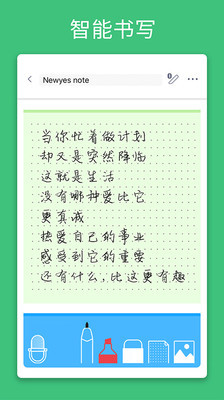 newyes笔记是一款专为搭配newyes智能书写套装设计的安卓应用,它将传统的手写记录与现代智能技术完美结合。用户只需通过蓝牙连接newyes智能笔与手写板或点阵码智能本,即可实现纸屏同步,将手写内容实时转化为电子文档。无论是会议纪要、随笔创作、绘画涂鸦还是日常笔记,newyes笔记都能轻松应对,并提供高效的编辑、整理和分享功能,成为用户工作、学习和生活中的得力助手。