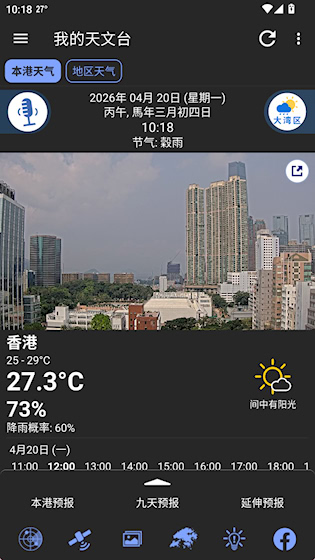 我的天文台是一款专业气象服务应用,为追求精准天气信息的群体设计,整合了实时气象数据、卫星云图和未来短时预报功能,随时掌握本地及周边地区的气象动态,帮助人们合理安排行程,规避恶劣天气风险,是值得信赖的天气管理助手。