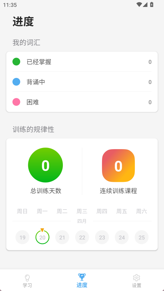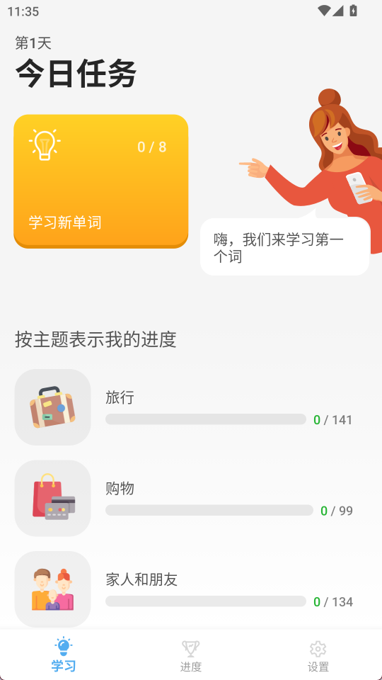 1、学习界面可以开始单词学习,下方展示了主题进度