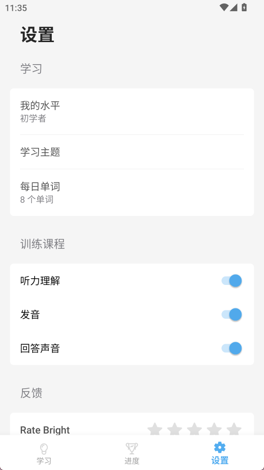 Bright是一款专为英语学习者打造的高效学习应用,通过科学方法帮助使用者轻松掌握词汇与语感,涵盖从基础字母到复杂句型的全面内容,满足不同阶段的学习需求,无论是初学者还是进阶者,都能找到适合路径,实现语言交流的自如运用。