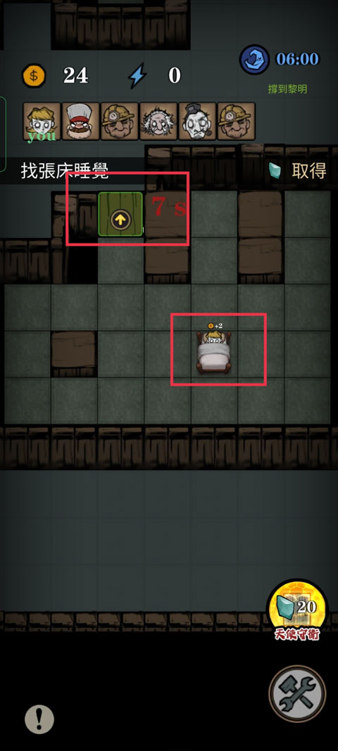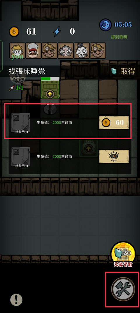 6、并通过收集的金币来升级床铺、门以及防御道具,提高安全等级,防止灵魂收割者将你拖走。