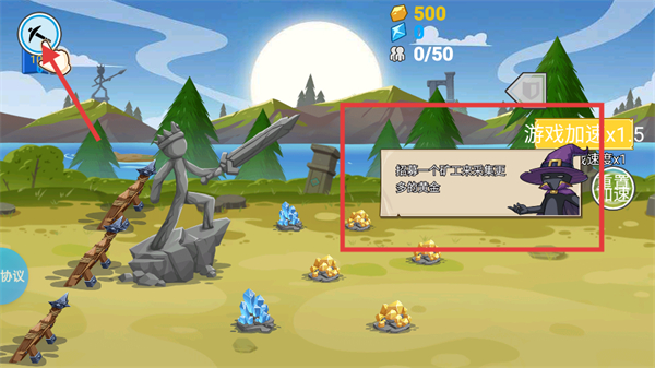 2、进入关卡后,根据界面提示点击矿工图标,招募矿工来采集更多的黄金资源。