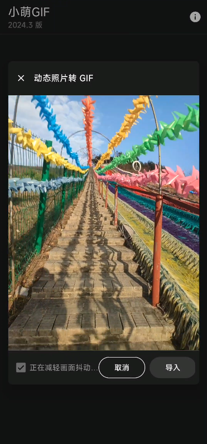 2、打开动态照片后,可以预览其播放效果。小萌GIF还内置了防抖功能,勾选后即可一键减轻画面抖动,提升成片稳定性。