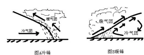 冷锋是冷气团主动向暖气团移动的锋(如图A)。在图中冷气团部分一般画有冷气团向前推进的方向箭头,它与暖气团在锋面上被迫抬升的气流运动箭头方向相反。暖锋是暖气团主动向冷气团移动的锋(如图B)。在图中,暖气团沿锋面爬升的气流方向箭头,与锋面另一侧的冷气团移动的方向是一致的。由此,可借助于冷气团的箭头方向来判别冷、暖锋。