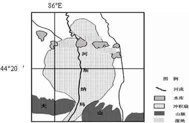 玛纳斯绿洲是新疆最大的绿洲农耕区和国内第四大灌溉农业区,在玛纳斯河冲积扇边缘有一条狭长的泉水溢出带,有“千泉”之称,人们以这里湿地中的湖泊或洼地为库址,修建多个水库,形成了一个规模巨大的湿地水库群,它上接大河、下通灌区。下图为玛纳斯冲积扇及其玛纳斯河流域示意图。