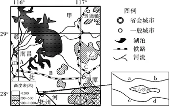 【解析】整体分析:该地区大部分海拔在200米以下,地形以平原为主,东部山地丘陵为主。凹岸是侵蚀河岸,a既是凹岸,又是北半球河流右岸,地转偏向力向右偏,侵蚀最严重。京九铁路南北走向,过南昌。农业生产的自然条件主要从气候、地形、水源、土壤角度分析。