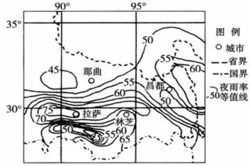 夜雨是重要的农业气候资源,其多少常用夜雨率表示。夜雨率是夜间降雨量占日降雨量的百分率。下图示意青藏高原部分地区夏季平均夜雨率(%)的空间分布。据此完成下面小题。