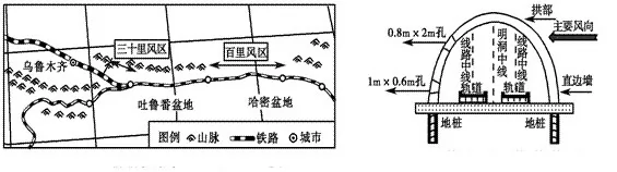兰新铁路第二双线东起兰州市,西至乌鲁木齐市,兰新铁路第二双线穿过著名的百里风区和三十里风区; 风力强劲,一年有320天都在刮八级以上大风;出现大风的频率高,每年冬春交替季节大风最为集中,盛行偏北风,起风速率快,风害极为严重。为了保证列车安全、快速、正常运营,最大限度地减少限速和停运,在百里风区和三十里风区修建了防风明洞。左图为兰新铁路第二双线风区示意图,右图为拱形防风明洞横截面图。