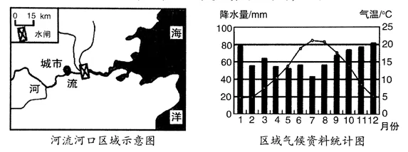 (【全国市级联考】山西省大同市与阳泉市2018届高三5月联合模拟考试)历史上,图中河流多次决堤泛滥,威胁到城市人口的生命和财产安全。图中水闸修建在523米宽的河面上,通过控制一个或多个河道之间的闸门可以减少朝向上游的水量。读该河流河口区域示意图及图示区域气候资料统计图,完成下面小题。