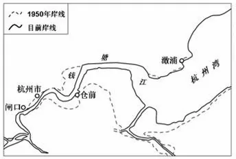 2.钱塘江河口段河床高度受径流与潮汐共同影响,在不同季节、不同河段受侵蚀或堆积作用而发生明显变化。研究人员曾连续多年对闸口至澉浦段河床高度进行测量,结果表明:枯水期仓前以西升高,以东降低。历史上钱塘江河口潮强流急,河床宽且浅,冲淤幅度很大,导致主河道摆动频繁。20世纪60年代以来,水利部门对钱塘江河口进行了治理,缩窄江道是其中重要措施(如图所示)。据此完成1~3题。