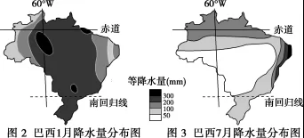 (2)据图2、图3说明巴西1、7月降水量的差异并分析原因。