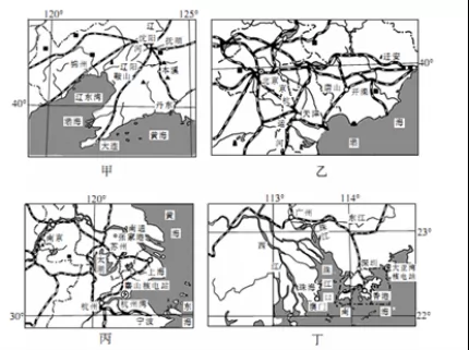 1.读图可知,甲为辽中南工业基地,为我国重工业基地,能源、淡水资源供应不足,环境污染严重;乙为京津唐工业基地,为我国的综合性工业基地;丙为沪宁杭工业基地,地处东南沿海,水资源丰富,市场广阔;丁为珠江三角洲,靠近东南亚,有国家政策支持。故本题选A。