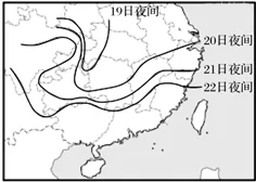 2016年1月20-23日,我国南方多地迎来了大范围雨雪冰冻天气,下图是该时段雨雪分界线推进示意图。据此完成下列各题。