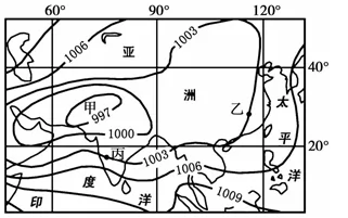 26.图中甲在亚洲南部低气压中心,应是印度低压;丙在南亚此时是夏季盛行西南季风;乙处等压线较丙稀疏,风力较弱;此时是北半球夏季,太平洋上是夏威夷高压强盛。选B正确。