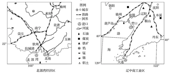 (2)读图可知:辽宁和广西两地铁路和海运交通发达,且石油资源丰富。广西的优势在于有色金属资源及水资源丰富,内河运输能力强;有丰富的水电资源,接近中东石油产地,节约石油的运输成本。