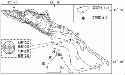 库赛湖位于藏北高原,冬季湖面结冰,冰上多分布有风沙活动带来的砂砾。湖底沉积物一年中由粗和细两层组成,下图为库赛湖地形及取样点沉积层垂直剖面示意图。读图回答下面小题。