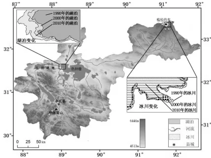 下图为色林错流域位置及冰川、湖泊面积变化图。读图,完成下列各题。