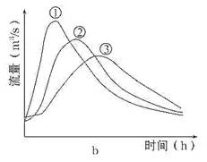 20. 假设该流域三个阶段都经历了相同的一次暴雨过程,在P处形成的流量变化过程与右图b中①、②、③分别对应的是(
