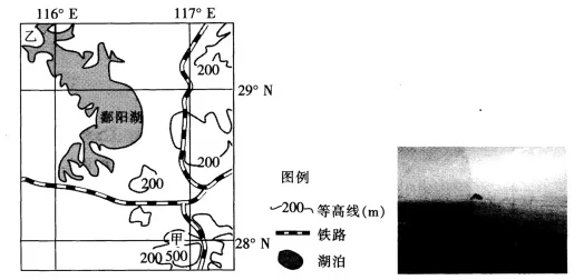2018年9月19日,航拍“中国最大淡水湖”鄱阳湖都昌水域,湖床变为茫茫草原。鄱阳湖标志性水文站星子站今年首次跌破12m,标志着鄱阳湖提前正式进入枯水期。2018年9月1日?11月4日,江西省平均降水量为65.1mm,较常年同期偏少60%。期间平均气温 为22.4℃,较常年同期偏高0.7℃。气候变化给鄱阳湖带来了严重的影响。大数据显示,近些年来,鄱阳湖进入枯水期的日期呈提前的趋势。为了保住鄱阳湖“一湖清水"的目标,江西省政府提出在乙处兴建鄱阳湖水利枢纽工程。下图为鄱阳湖地区略图。