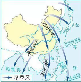 ①西北季风。冬季,亚洲中部发育着蒙古-西伯利亚高压,太平洋北部为阿留申低压,风由高压吹向低压,并向右偏转,因此形成了西北季风;