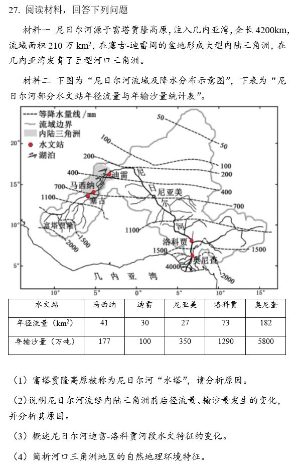 (2)分析内陆三角洲对径流量、输沙量的影响。①要明确,题目中所说的为内陆三角洲(不是河口三角洲),因此指的是图中的阴影部分,即塞古-马西纳-迪雷水文站之间;②从表中可以看出,从马西纳到迪雷,年径流量和输沙量都减小,并且三角洲具有调蓄功能,因此径流量的季节变化也会减小;③该内陆三角洲地势平缓,河流流速减慢,有利于泥沙的沉积,因此输沙量减少;该内陆三角洲位于15°N左右,应该为热带草原气候,全年降水较少(200mm~700mm),且蒸发旺盛,并且河流流速减慢,下渗增多,因此径流量会减少。另外,从图中可以看出,该地区湖泊众多,具有较强的调蓄能力(削减洪峰、旱季补给),使得河流全年的径流量较为稳定。