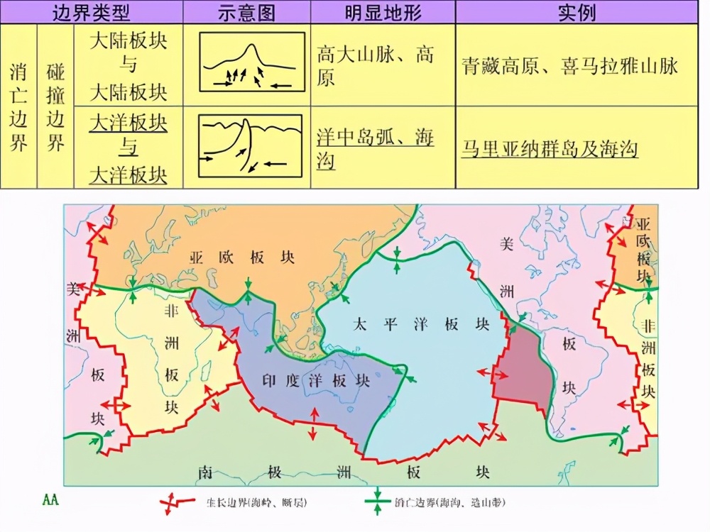 ②消亡边界:两个板块相互挤压,距离越来越近,常常会形成山脉、岛弧、海沟(下图中的绿色边界)。世界主要的火山地震带(环太平洋火山地震带、地中海-喜马拉雅地震带)也分布在消亡边界。