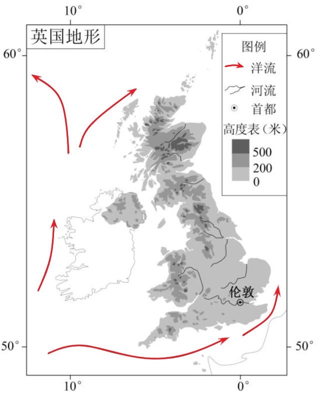 下图为英国的地形、洋流分布图,读图回答2~3题。