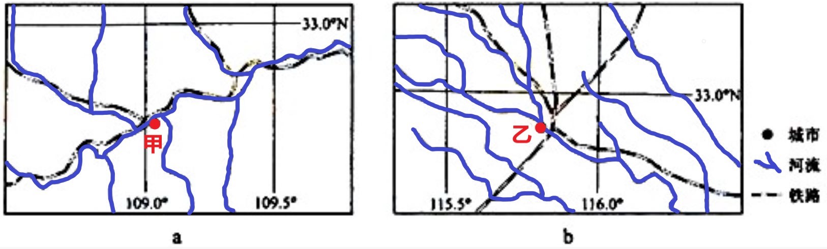 读下图,甲、乙为两个城市,蓝色的为河流。完成1~2题。