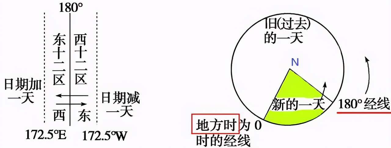 日期的变更,与两条重要的界线有关:自然日界线(0:00对应的经线)、国际日界线(180°经线)。