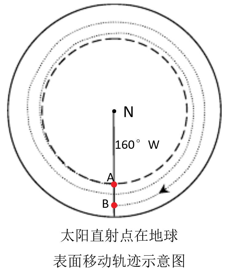 (4)分析太阳的移动轨迹。①从A点到B点,沿着西(略微偏南)的方向走了两圈,每一圈为一个太阳日(24小时);②因此从A点到B点,一共经过了两个24小时,即为48小时。
