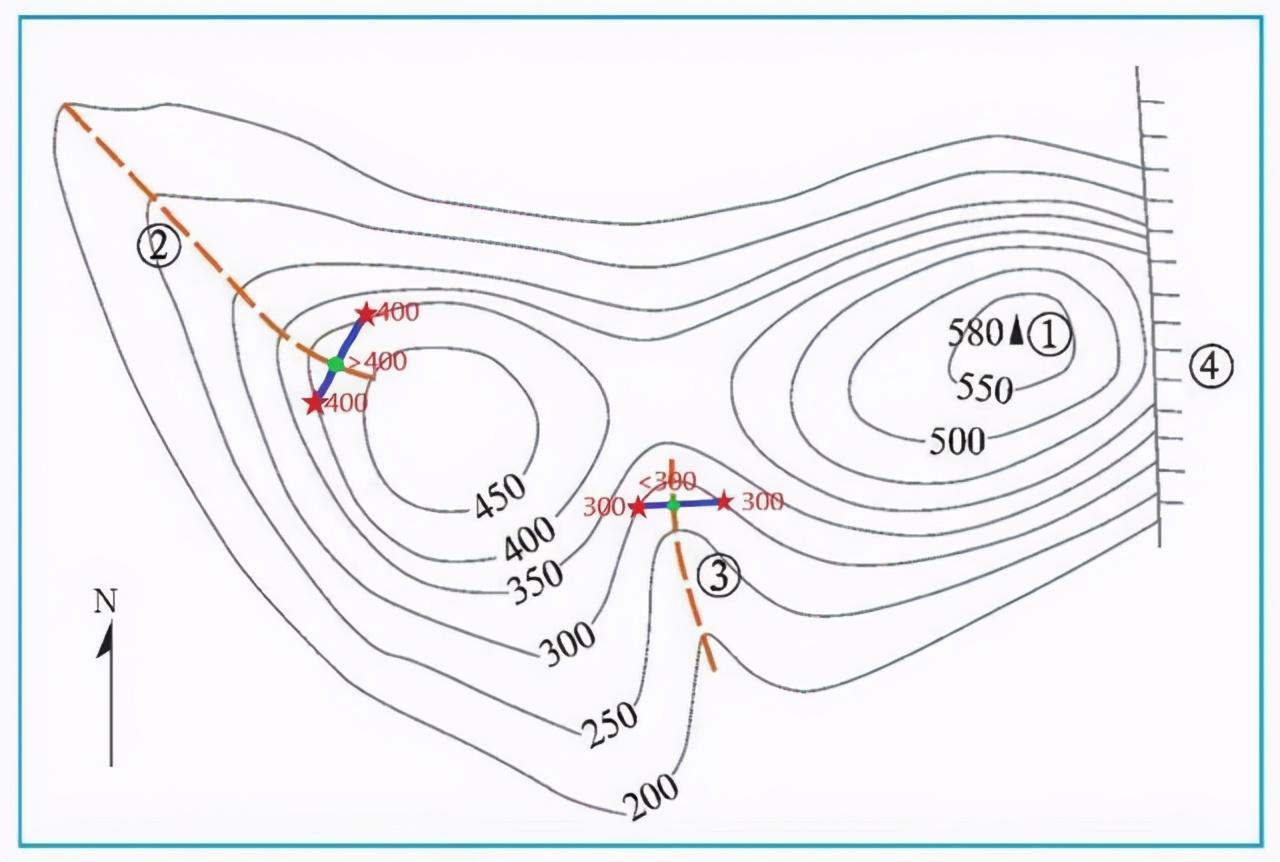 ②看两侧海拔。沿着等高线弯曲的方向,画出山脊线或山谷线。垂直于山脊线或山谷线,作一条垂线,与两侧等高线相交。如果中间海拔高、两侧海拔低,则为山脊(下图中的②),中间低两侧高则为山谷(下图中的③)。