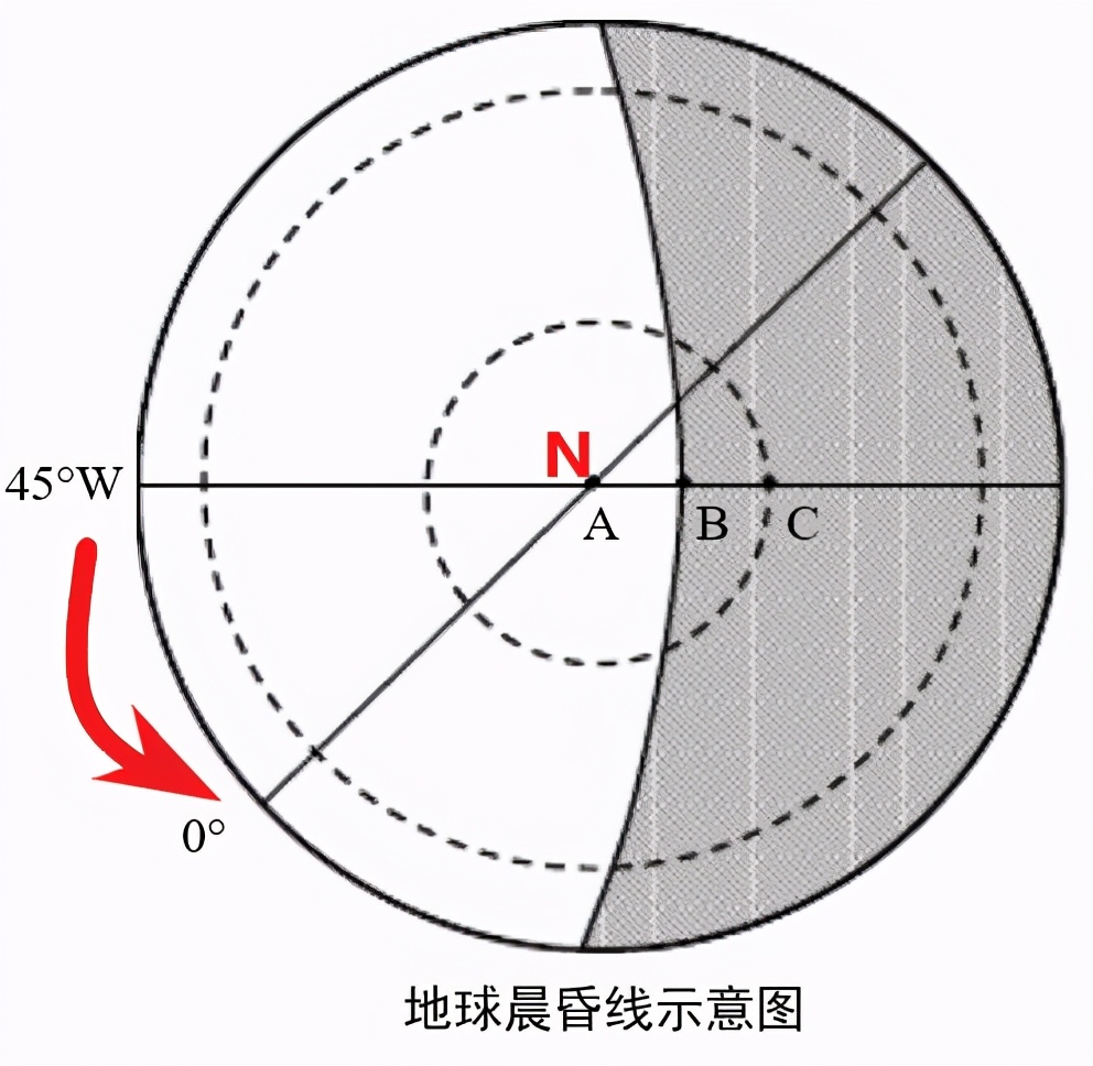 (2)分析晨昏线的位置对应的季节。①图中为北半球,则晨昏线由A点以东到C点的,即由北极点移动到北极圈,则北半球由昼夜等长,变为昼最长、夜最短(夏至,6月22日左右);②因此,晨昏线由A到C的过程,应该是由春分(3月21日左右)到夏至的过程(6月22日左右);③因此,晨昏线到达A点时的日期约为3月21日(或22日),春分与夏至间隔3个月,B点位于中间,即与春分间隔1个半月,即为3月21日+45日,因此可能为5月5日(或6日、7日)。