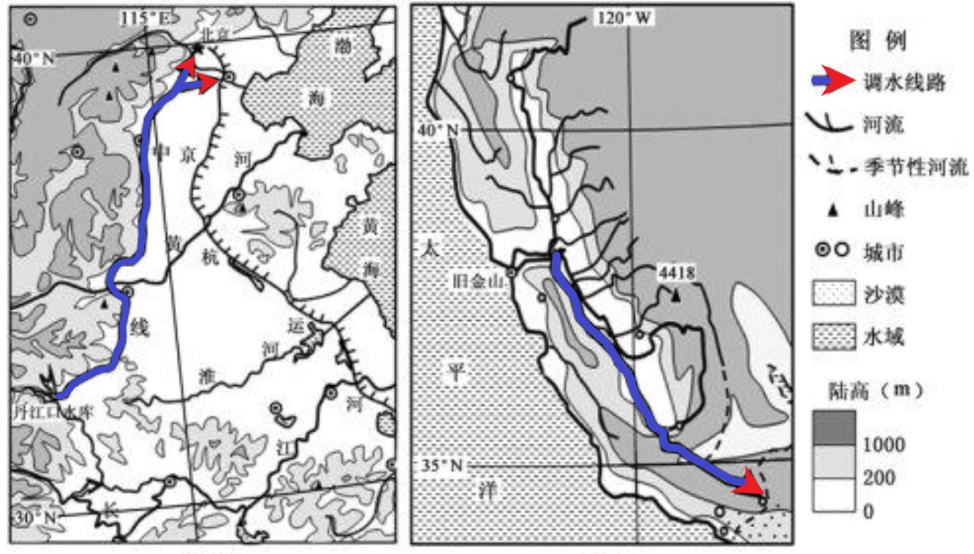 【材料一】:下图分别为我国的南水北调中线工程、美国加利福尼亚州的南水北调工程线路示意图。