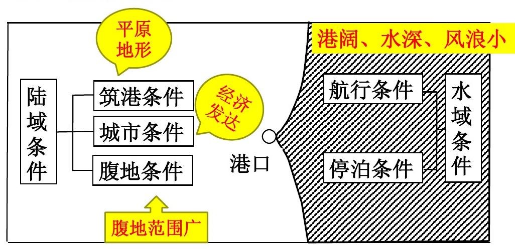 ①自然因素:地形平坦开阔,水域较深,风浪较小,不易淤积,无结冰期(或结冰期较短);