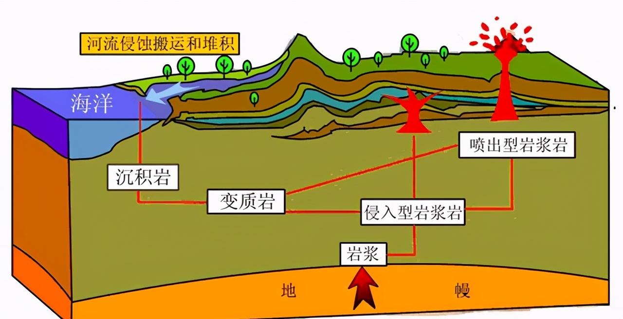岩石物质循环模型,说明岩石通过不同的过程,可以从一种形态转化成为另一种形态。