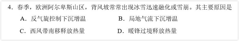 (2)分析其他的气候影响因素。①从题干可知,阿尔卑斯山的“背风坡”,而不是迎风坡。而反气旋控制下,不论迎风坡还是背风坡,气流都会下沉,不仅仅是只有背风坡;②西风带南移对气候的影响,也会同时作用于迎风坡与背风坡,而不仅仅是背风坡;③暖锋,是指暖气团主动向冷气团移动,会带来温度的升高和降水。但暖锋的影响范围很大,并不会仅仅只影响背风坡。因此综合来看,反气旋、西风带和暖锋的影响都范围都很大,迎风坡与背风坡都会受到较大影响,因此不符合题意。