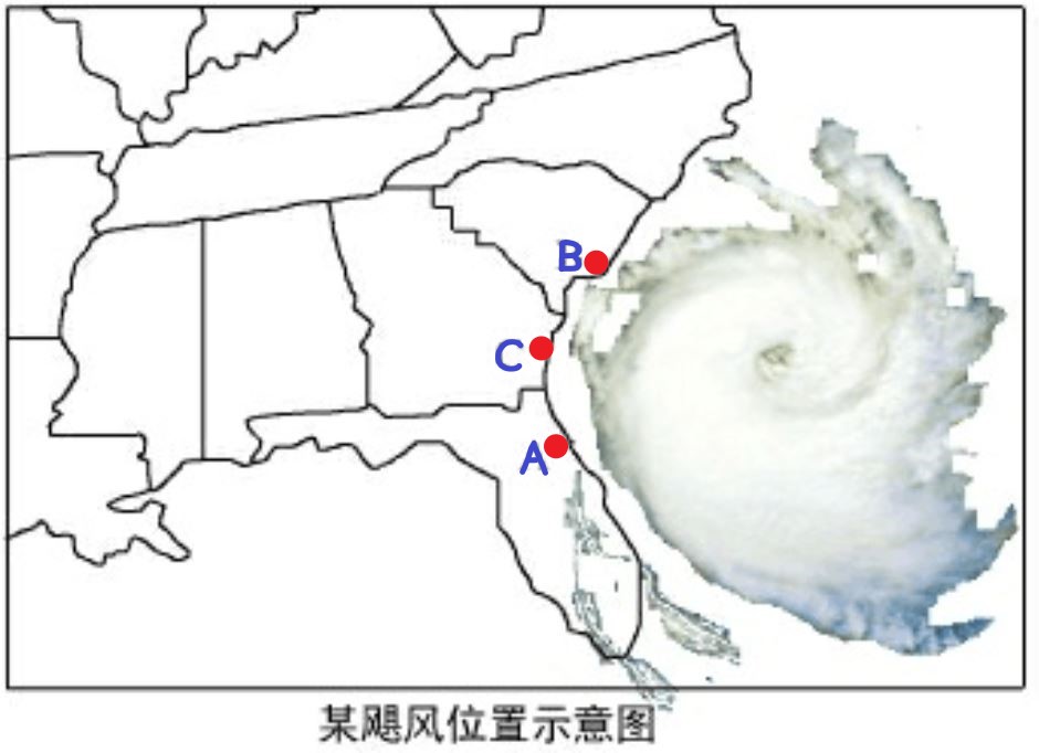 (3)图中的飓风向西移动,中心到达C地时,____(填A或B)地更容易遭受风暴潮的袭击。