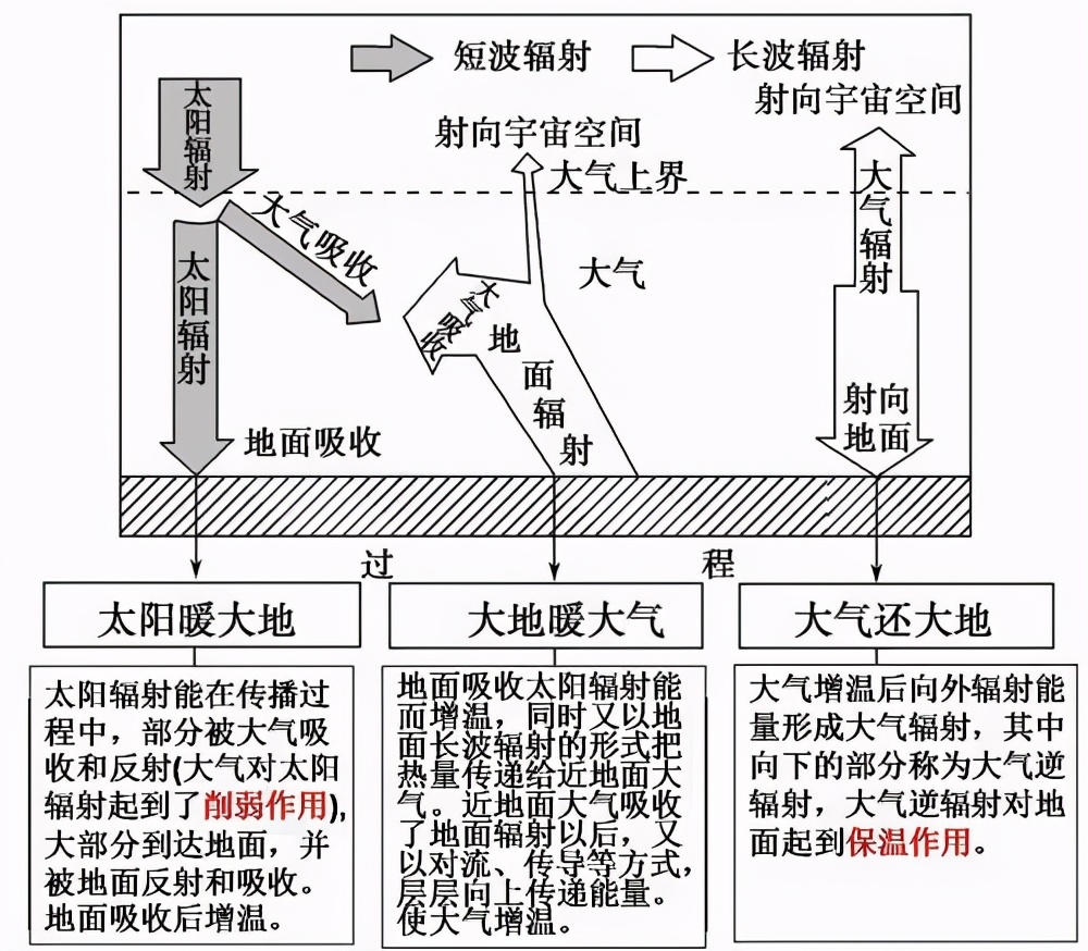 ①太阳暖大地:射向地球的太阳辐射(短波辐射),一部分被大气吸收和反射,另一部分到达地面,被地面吸收,使得地面温度升高;